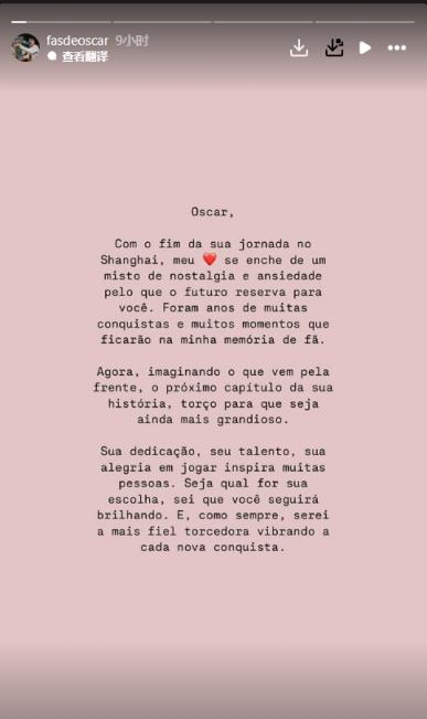 12月20日訊 奧斯卡的國外球迷團體在社媒發告別信,稱奧斯卡在中國的旅途即將結束。