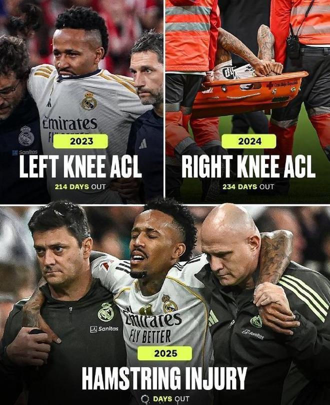 這一幕刺痛了所有皇馬球迷和巴西國家隊支持者的心。在2023年8月和2024年11月連續兩次遭遇膝蓋十字韌帶重傷后,當這位27歲的巴西國腳似乎剛剛找回狀態,無情的傷病又一次向他襲來。數據統計顯示,自2023年8月首次重傷以來,米利唐只為皇馬出戰了143場正式比賽中的46場。(27歲的米利唐,連續三年遭遇重傷,2023年8月,左膝ACL,休息214天才復出;2024年11月,右膝ACL,休息234天才復出;2025年12月,左大腿腿筋拉傷,暫時未知傷情的嚴重程度和缺陣時間。)